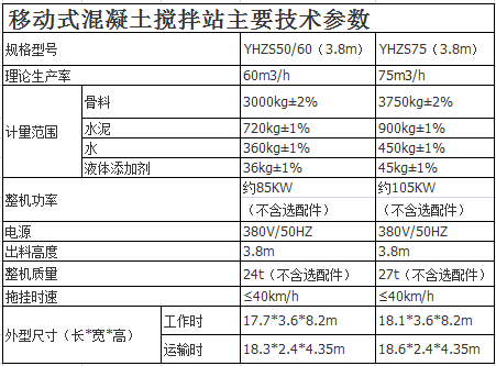 我公司主要生产YHZS35/50/60/75型移动式混凝土搅拌站。移动式搅拌站是将混凝土搅拌站的物料储料、称量、输送、搅拌、卸料及全自动控制系统整体集中与一个拖挂单元的混凝土生产设备;它与固定式全自动搅拌站的所有动作过程、操作方式、维修保养完全相同;同时具备移动灵活、拆装迅捷简便、存放管理简单等有的特点;是公铁路、桥梁、港口、水电等工程移动施工中的优配机型。
