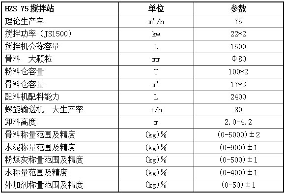 HZS75混凝土搅拌站是由配料、搅拌、电气控制系统等部分组成的全自动混凝土拌制成套设备,同时配有单手动控制、落差自动补偿、砂石含水率补偿,能自动完成预定罐次生产.理论生产率75立方/小时,卸料高度为3.8米,储料斗容积为8立方*3仓或4仓,配套主机是JS1500型强制式双卧轴搅拌机。HZS75混凝土搅拌站的投资资金量少,占用场地小,动用设备少,设备维护容易,可以配备高性能的立控制室,使设备操作方便安全,并且在配料机计量准确的情况下也能够生产有效的混凝土。